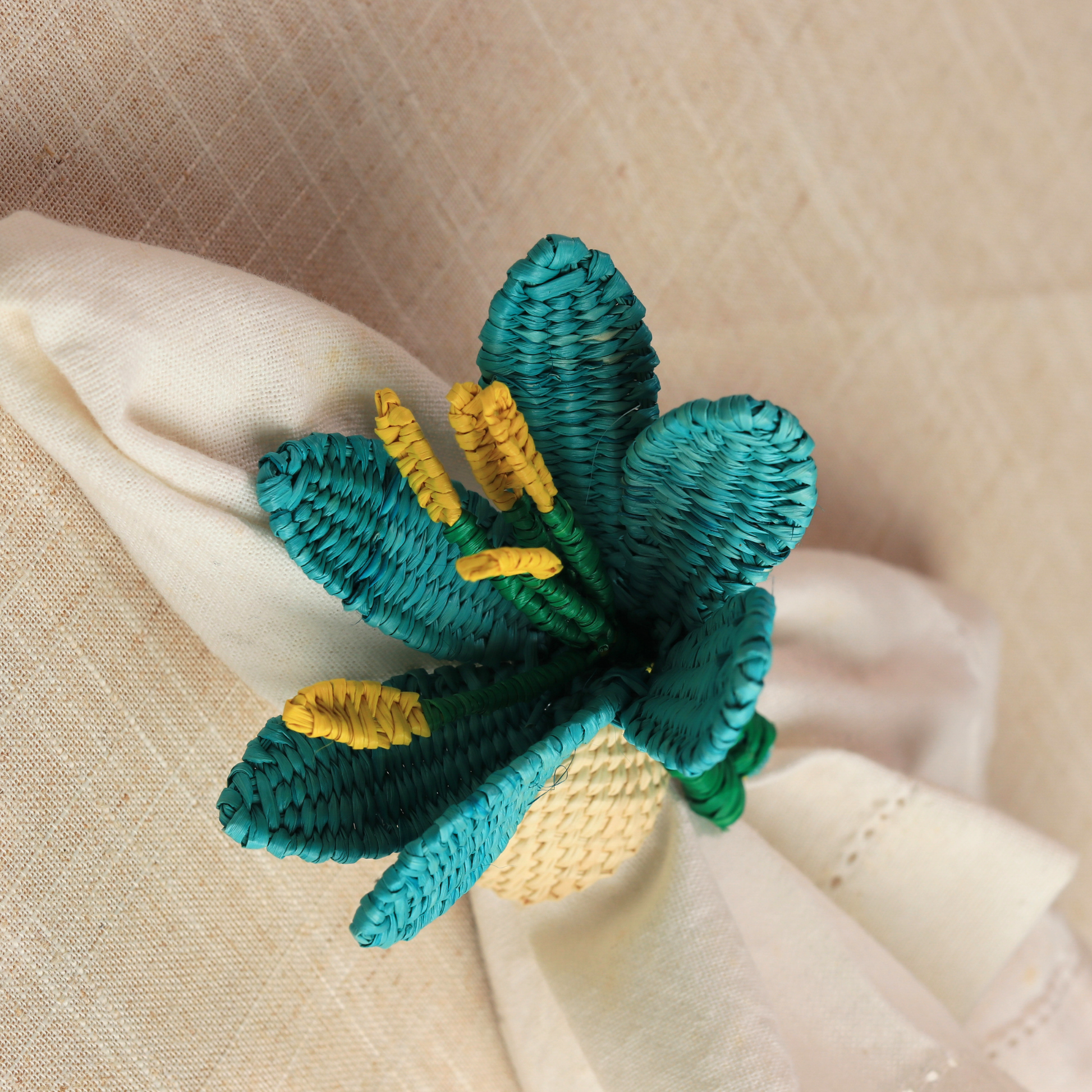 Each piece is meticulously woven from natural iraca palm by Colombian artisans, showcasing layered turquoise petals and delicate yellow stamens that add both color and dimension to your tablescape.
